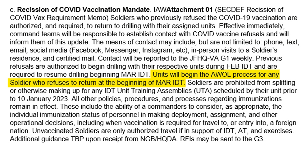 As you can see, the memo begins by referencing the change in policy and first inviting the rejected soldier to come back and resume participation in regular drills and training. Well, that is a reasonable invitation. It would have been nice to offer back pay, but it’s a nice gesture to reinvite them, nonetheless. However, the letter continues to emphatically clarify that this is not a mere invitation; it’s an order. “If you fail to participate in training on or after 20 March 2023 without an approved STA or other exemption you will be considered Absent Without Leave (AWOL) and may become subject to MCMJ or other adverse administration actions.”