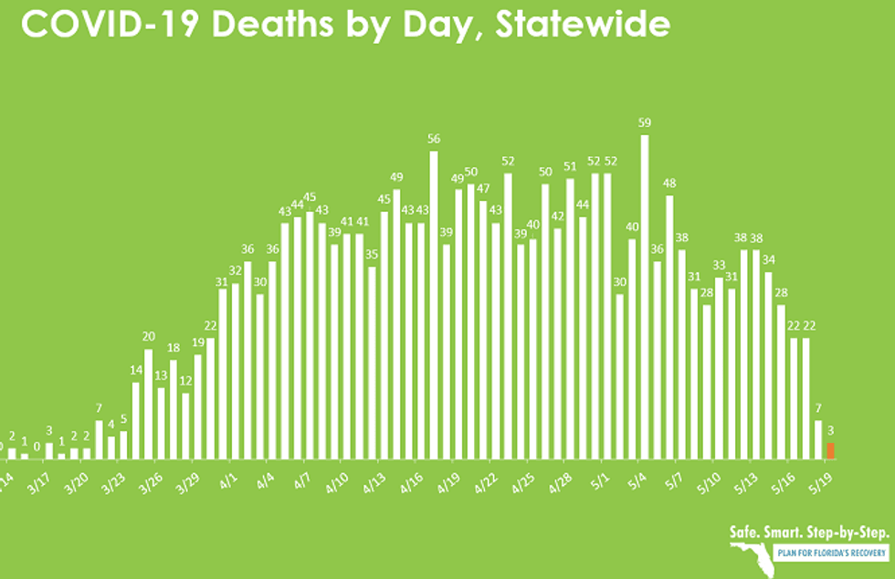 They said DeSantis was killing his state's people by not issuing a stay-at home order early enough and never issuing a full lockdown against church services and other activities. Then, on May 4, he decided to end even the tepid lockdown. Last in, first out. What are the results?