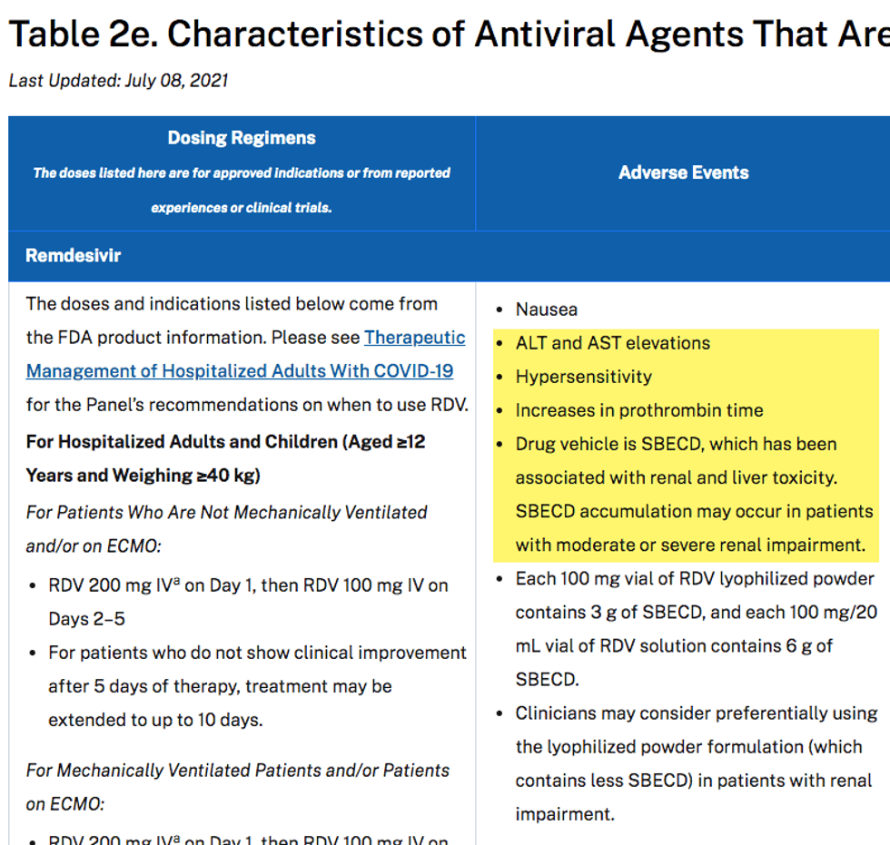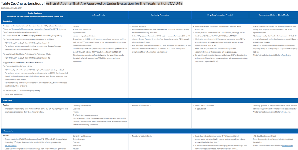 Although the NIH and the FDA didn't officially approve ivermectin as standard of care for COVID, it is listed on NIH's website right under remdesivir as "Antiviral Agents That Are Approved or Under Evaluation for the Treatment of COVID-19." It is accorded the same status, the same sourcing for dosage recommendations, and the same monitoring advice as remdesivir ... except according to NIH's own guidance, remdesivir has a much greater potential for severe reactions in the very organs at stake in a bout with acute COVID.