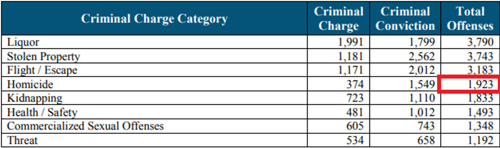 Typically, this is the tally of criminal offenses among those arrested by ICE in a given year, totaling nearly 470,000 in FY 2019. And these numbers would roughly mirror that total every year. Now consider the fact that this year ICE reduced its apprehension numbers. Imagine how many of these people with these rap sheets remain in the country. Well, they did publish the tally for five of the most serious categories: Homicide, 1,506; sex assault, 3,415; assault, 19,549; robbery, 2,717; kidnapping, 1,063.