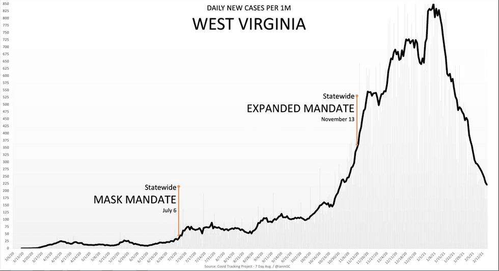 This man is taking the starting point and the end point of the virus, all the while forgetting that the cases went up 1,800% long after all of his insanity was in place and only went down afterwards once the seasonal spread was over, as was the case in every single state and every country around the world! Some maskers suggest that mask mandates only work if they were in place early when cases were low. Well, that is exactly what happened in West Virginia!