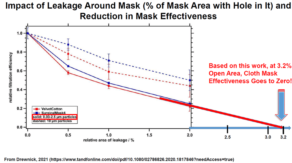 Stephen Petty, one of the most experienced certified industrial hygienists and exposure experts in the country, sent me the following chart based on new research on mask filtration (Drewnick, et al.). It demonstrates that if just 3.2% of the mask space is open, the efficacy of the mask goes down to zero!