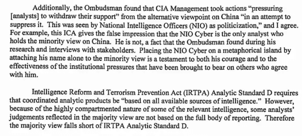 "Given analytic differences in the way Russia and China analysts examined their targets, China analysts appeared hesitant to assess Chinese actions as undue influence or interference," Zulauf wrote. "These analysts appeared reluctant to have their analysis on China brought forward because they tended to disagree with the Administration's policies, saying in effect, I don't want our intelligence used to support those policies."