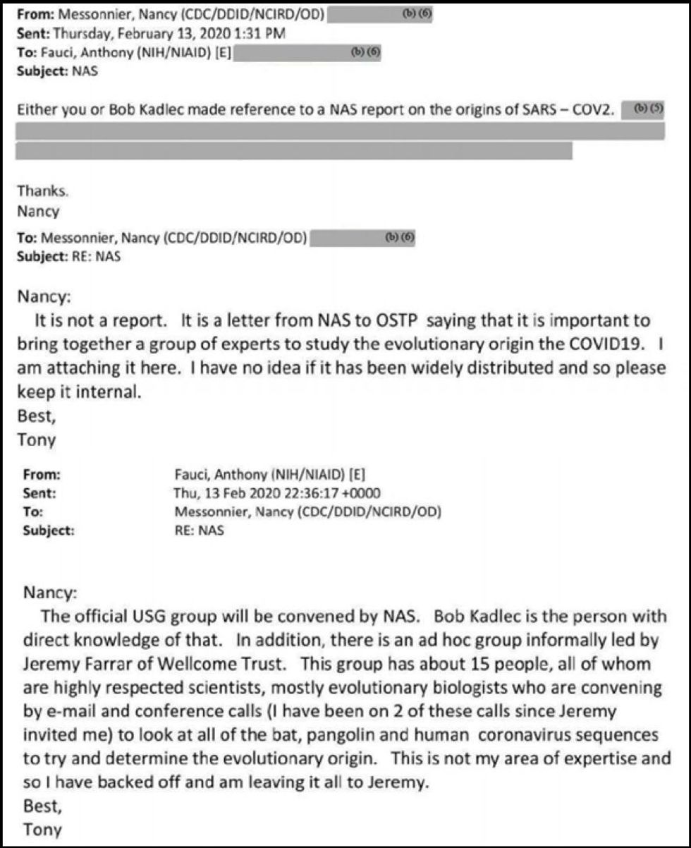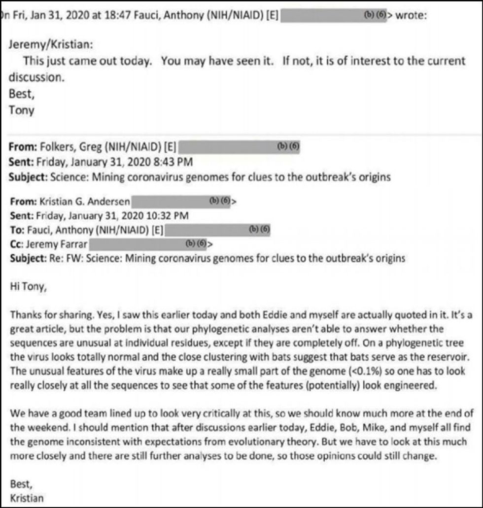 I've pondered the contents of the emails that were redacted before release, but I can't imagine what could possibly be redacted that is worth protecting. The West didn't make COVID-19, even if it taught the Chinese how to do major aspects of it. But, these people did decide to lie from the start, then continued to do so after it exploded from 40 deaths to 4 million. It means that they refuse to call a spade a spade even now, and the prospect of China getting off scot-free as a direct result is horrifying. The protection of Fauci is a midterm election decision only, and that means the goal is to drag this out until the electoral damage can be mitigated. Anything that clarifies this to the public negates being worthy of redaction.