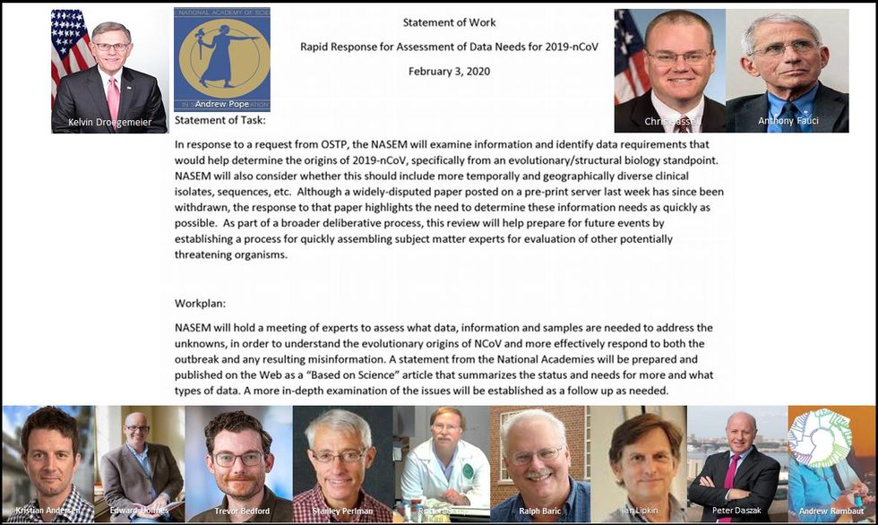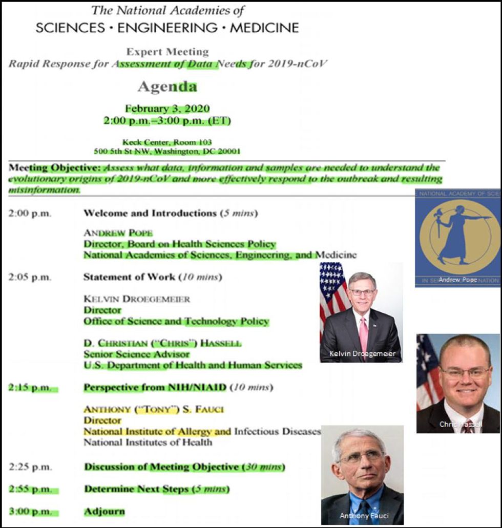 Note: NIAID Director Dr. Fauci coordinated this meeting with Kelvin Droegemeier, the presidential science adviser, and included WMD/PPP expert Chris Hassell and the National Academies' policy director, Alexander Pope.