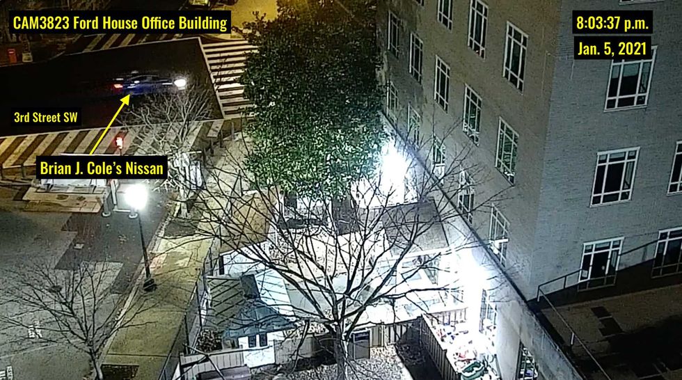 The hoodie-wearing suspect’s likely resupply mission presents a possible problem for the FBI’s timeline. At 8:03 p.m., security cameras captured what Armitas believes to be Cole’s blue Nissan Sentra traveling north on 3rd Street SW toward C Street SW, according to several USCP cameras along the route.