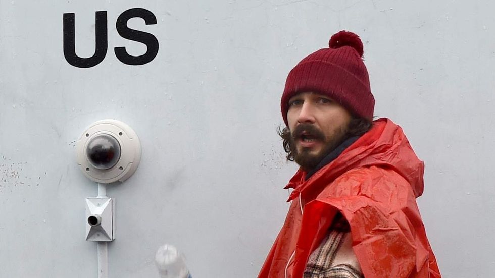 US actor Shia LaBeouf(C) during his He Will Not Divide Us livestream outside the Museum of the Moving Image in Astoria, in the Queens borough of New York January 24, 2017 as a protest against President Donald Trump.