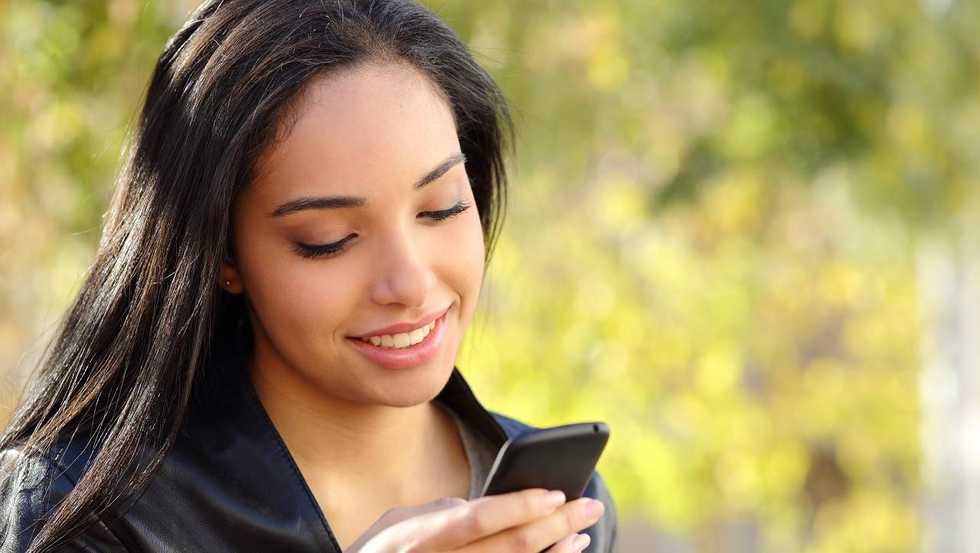 Portrait of a beautiful woman typing on the smart phone in a park with a green unfocused background