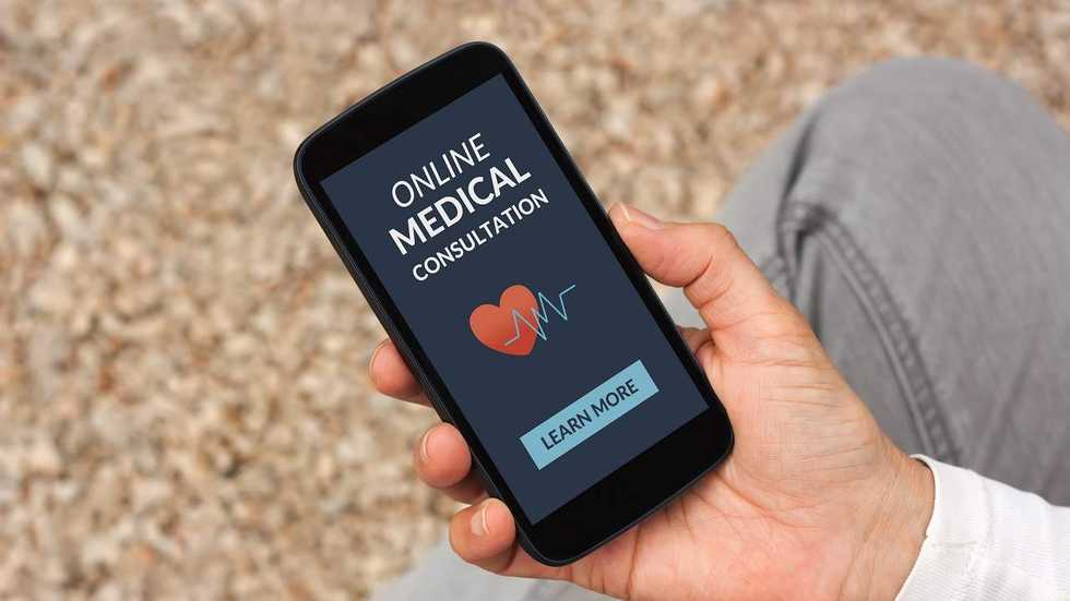 Hand holding smartphone with online medical consultation concept on screen. All screen content is designed by me