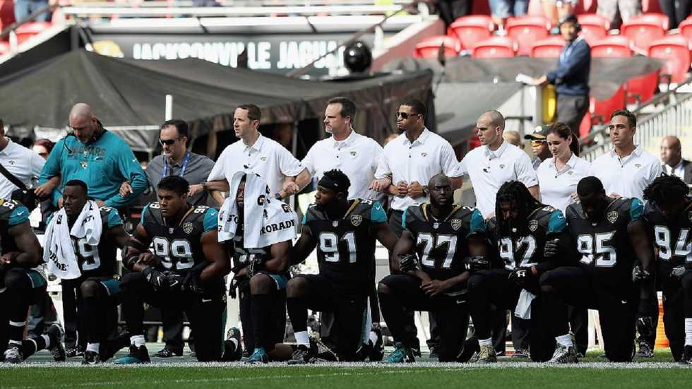 The game was between the Baltimore Ravens and the Jacksonville Jaguars where players, owners, and coaches locked arms on the sidelines while others knelt during America's national anthem.