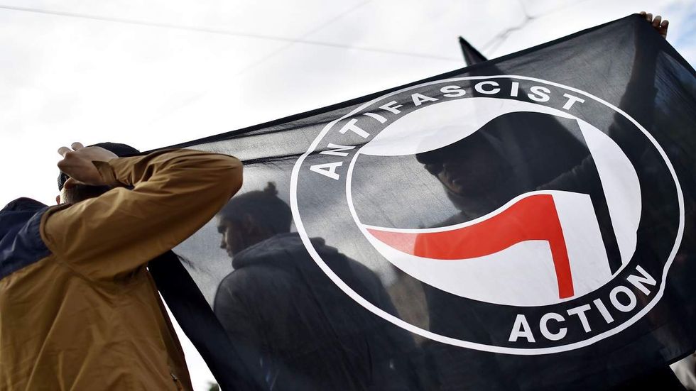 Demonstrators hold an Antifascist Action flag during a demonstration against the controversial labour reforms of the French government in Nantes, western France, on September 15, 2016.