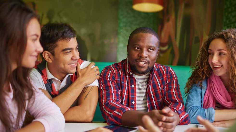 Friendly teens talking in cafe (shironosov/gettyimages)