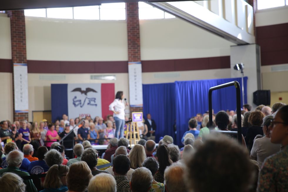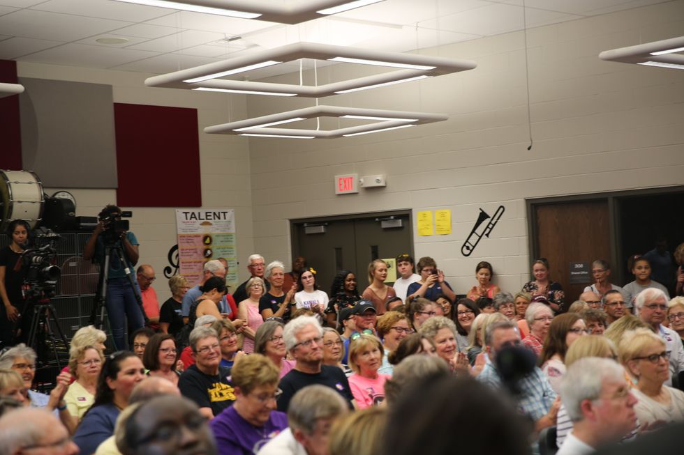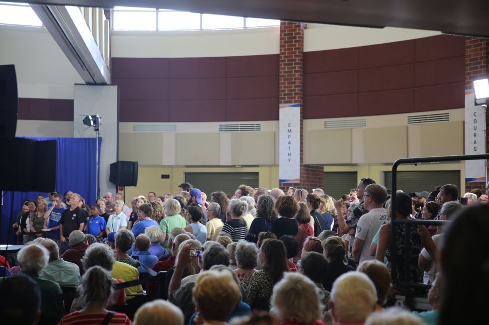 Now, a fresh crowd had gathered in the band room of Fort Dodge Middle School. Mostly middle-age. In T-shirts or blouses and cargo shorts or khakis or jeans. Packed room, all seats taken, people slanting along the walls.