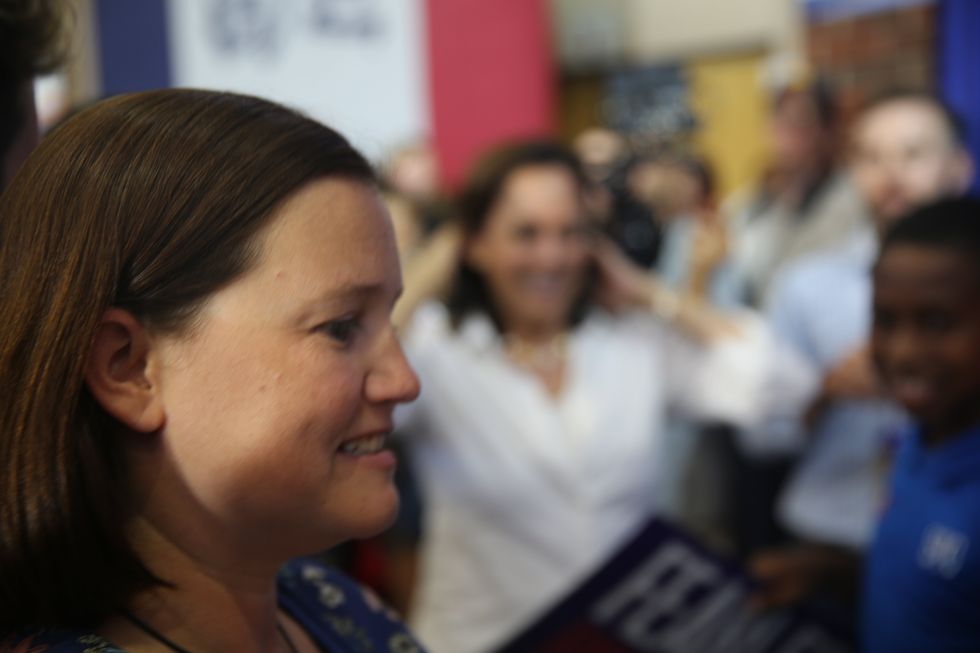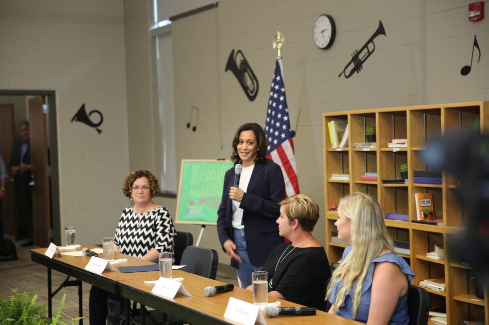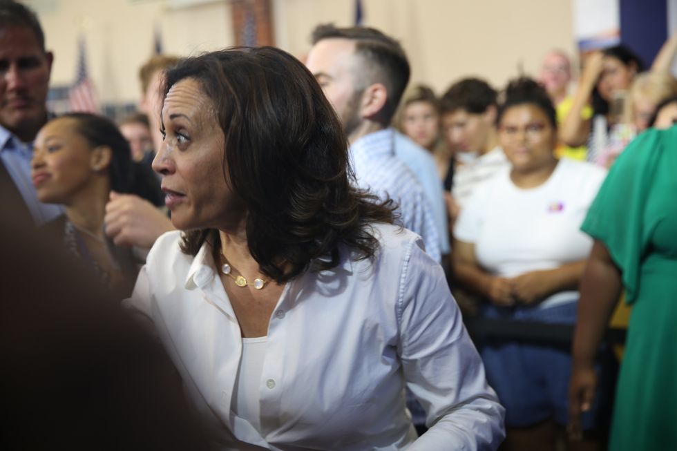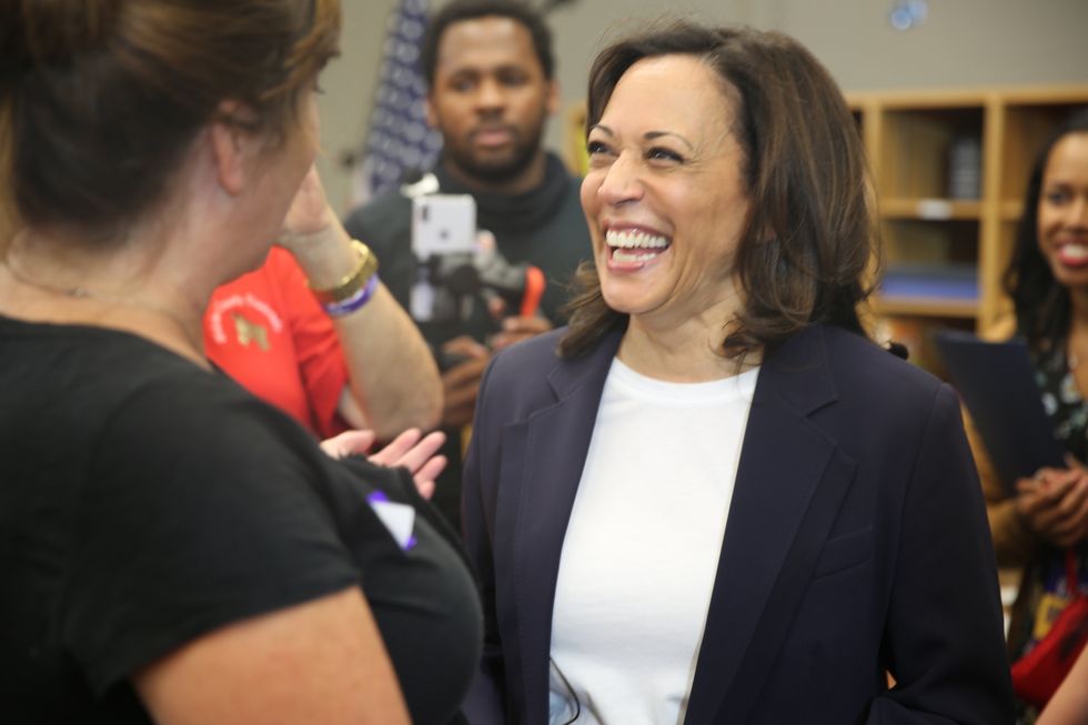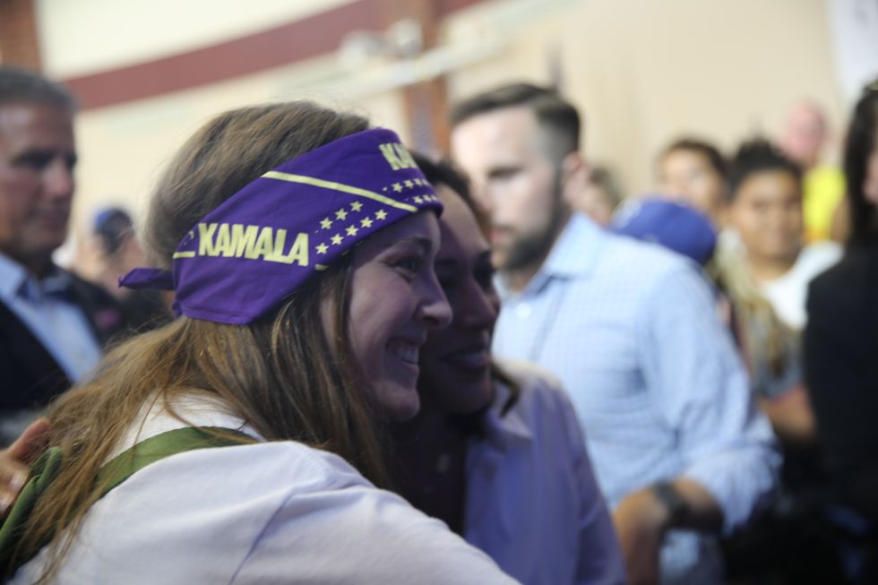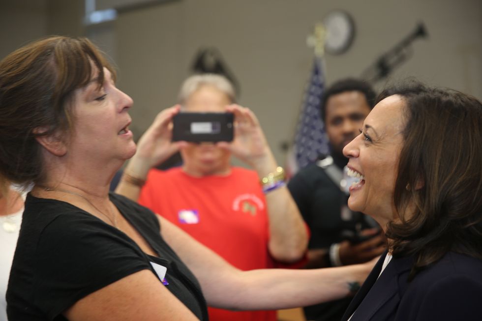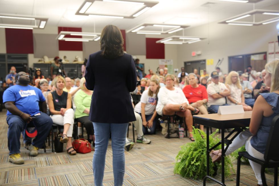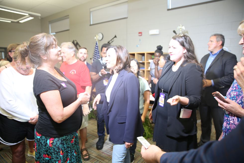 It was 5 p.m., and Harris had started late because her tour bus maxes at 55 mph, and everywhere she goes, people want her time.