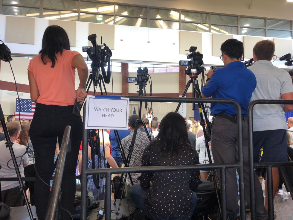 This environment lended itself perfectly to any pauses and music. It was sultry in that middle school bandroom, about 86 degrees. Made hotter by the studio lights facing the table and the media with all their cameras and recorders and laptops. The floor was a snake pit of extension cords and outlets and cables. At both sides of the room, skyhook light-rigs like you see on movie sets.