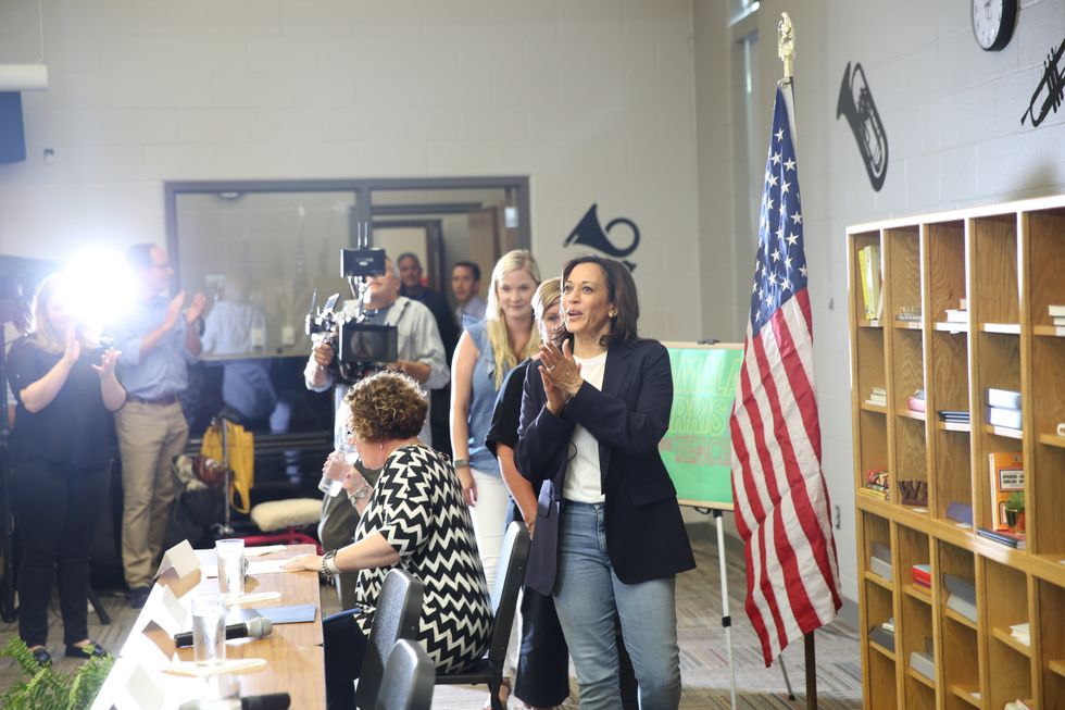 Harris wore the affect of a careful listener. When she asked a question she'd lower the mic onto the table. Then she'd follow up with a well-crafted answer. Stories that got to the point. Numbered arguments.