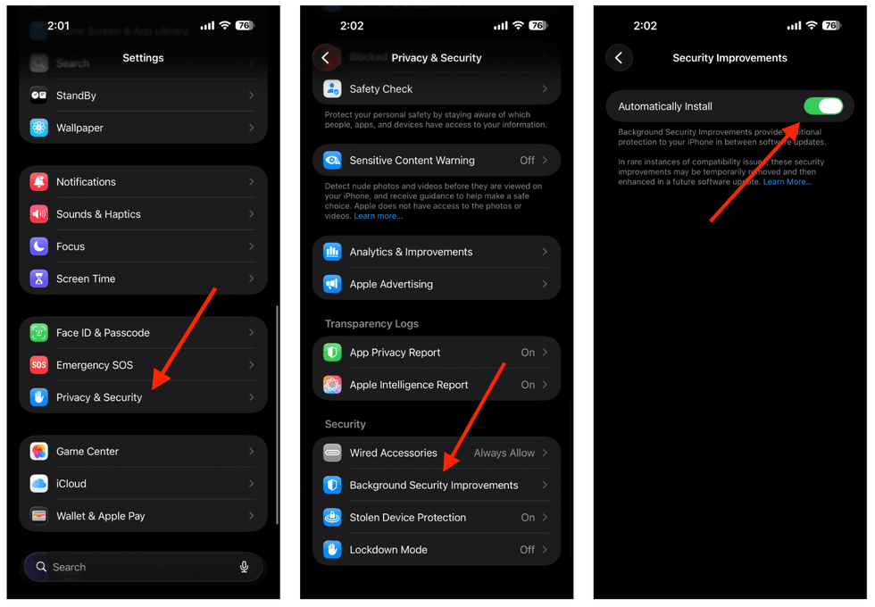 In addition to major operating system releases, Apple has started to issue smaller “Background Security Improvements” for its major mobile platforms. These updates are meant to provide faster solutions to potential threats between larger software versions. To ensure that your device receives Background Security Improvements, open the “Settings” app, tap “Privacy & Security,” select “Background Security Improvements” at the bottom, and check the toggle beside “Automatically Install.”