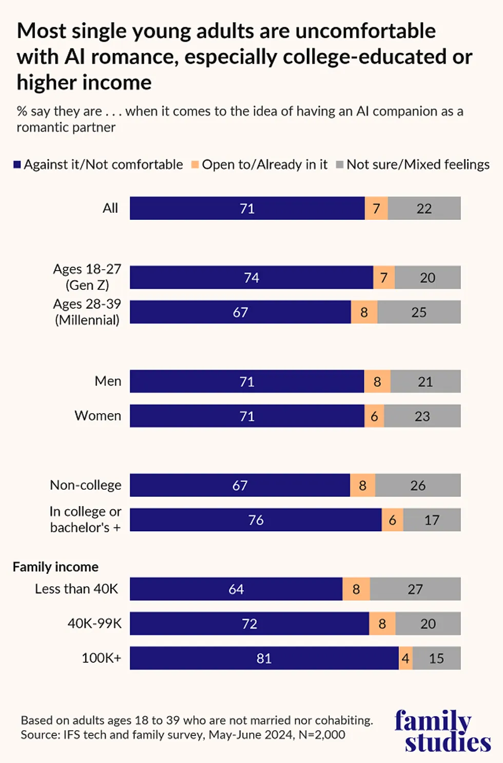 When it comes to young adults who are not married or "cohabitating," 7% said they are open to the idea of being in a romantic partnership with AI.