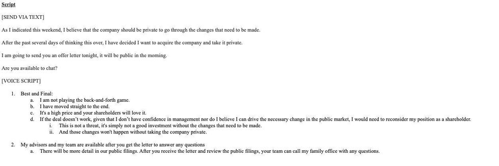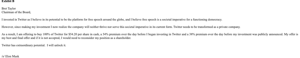 As a result, I am offering to buy 100% of Twitter for $54.20 per share in cash, a 54% premium over the day before I began investing in Twitter and a 38% premium over the day before my investment was publicly announced. My offer is my best and final offer and if it is not accepted, I would need to reconsider my position as a shareholder.