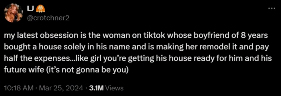 “This is the context: There's a 28-year-old woman on TikTok (she's now deactivated her account). ... She's helping her boyfriend of eight years remodel his house; however, he purchased the house in his name, is charging her rent, and is, according to her, making her pay half of the remodeling expenses,” she reports.