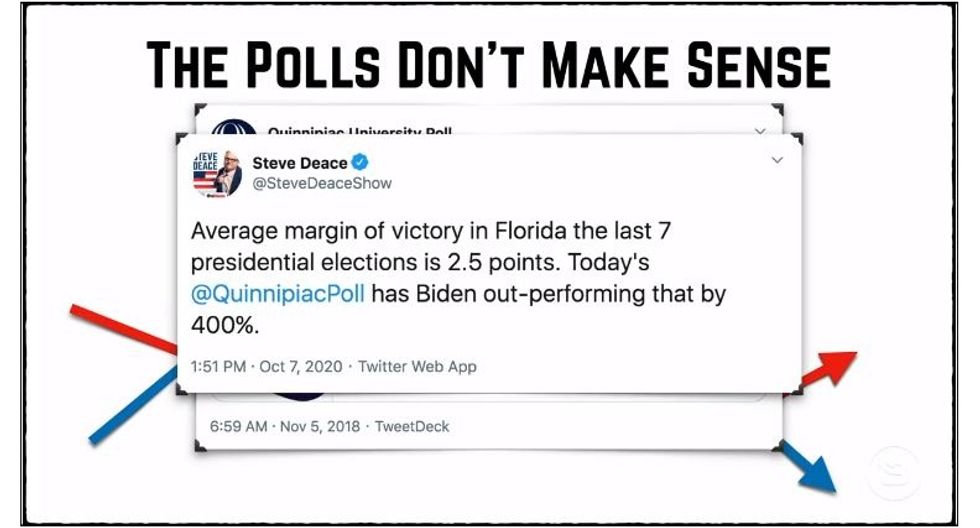 According to Deace, it is impossible to win a presidential election without winning the state of Florida. The latest Quinnipiac poll has Biden outperforming the margin of victory (+/- 2.491%) in the last seven presidential elections by 400%.