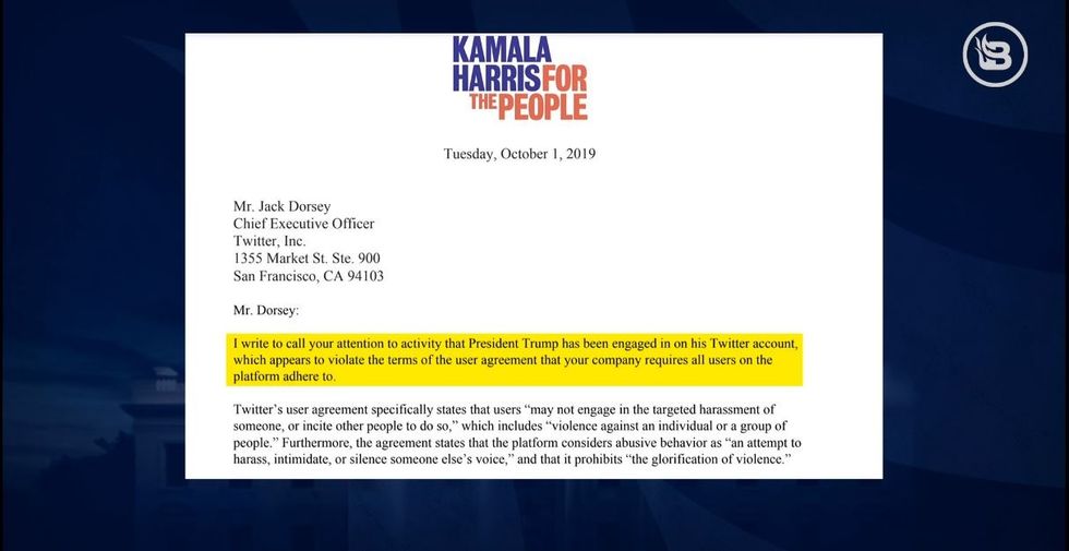On Wednesday's episode of "White House Brief," Jon discussed Democratic presidential candidate Kamala Harris and the letter she sent to Twitter CEO, Jack Dorsey, that attempted to compel him to suspend President Donald Trump's Twitter account on the grounds of "a threat to national security."