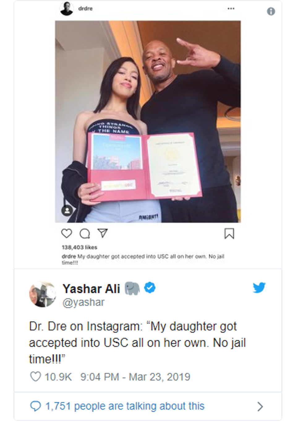 Dr. Dre's comments came after the recent college admissions scandal rocked the nation that involved former "Full House" actress Lori Loughlin as well as other stars caught by the FBI and arrested for having paid USC large sums of money so their children would be accepted.
