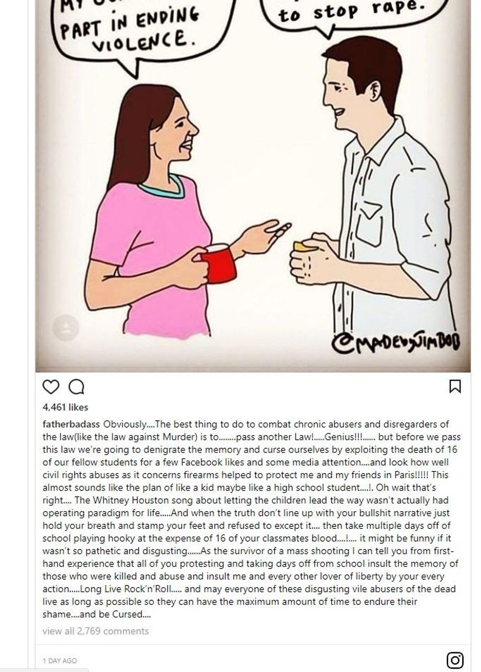 In an Instagram post that has since been deleted, Jesse posted a photo of an illustration of a woman and a man discussing gun laws. "I turned in my gun to do my part in ending violence," says the woman in the illustration. "I chopped off my own d*** to stop rape," replies the man.