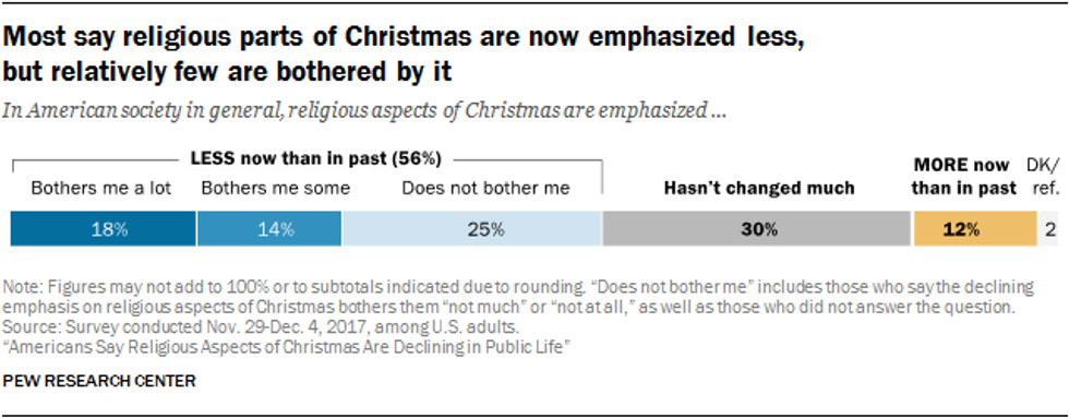 According to a new survey (you've heard that one before), Americans believe religious aspects of Christmas are declining in the public sphere. The Pew Research Center surveyed U.S. adults between November 29-December 4, 2017 and found: