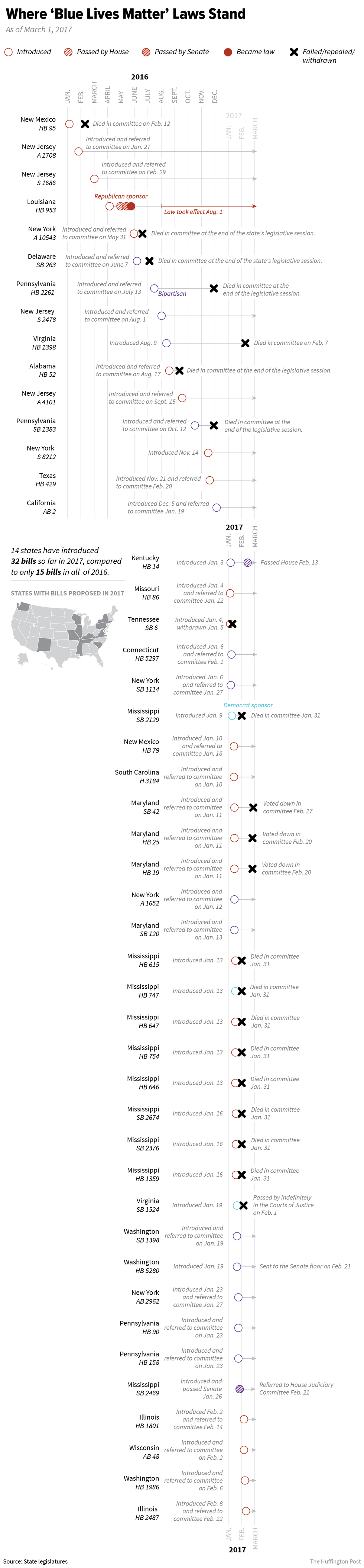 The infographic below from the "Huffington Post" illustrates the status of every "Blue Lives Matter" bill introduced in 2016 and 2017: