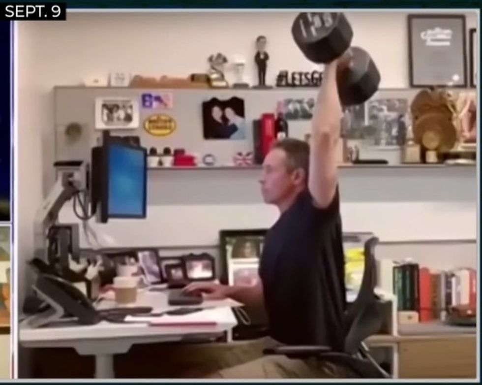 The photo shows Cuomo casually holding a 100-pound dumbbell over his head with one hand, while casually typing with the other.
